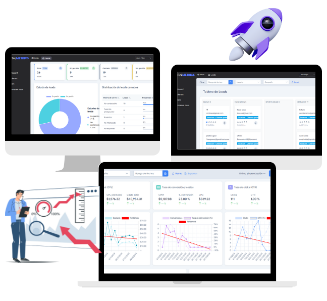 Monitorea tus campañas y controla la gestión de leads de tu equipo de ventas de manera fácil y rápida, potenciando tus ventas con información precisa y actualizada.
